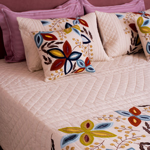 Discover the luxurious Amara quilted bedcover. The beige cotton-linen base offers a warm, inviting backdrop that complements a variety of decor styles.What makes Amara truly special is its rustic floral embroidery in vibrant oranges and greens. These earthy, nature-inspired details bring a touch of the outdoors to your sleeping space, adding warmth and character. The skillful embroidery showcases fine craftsmanship and attention to detail.