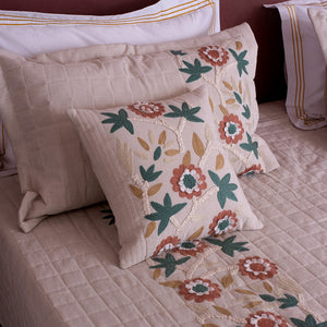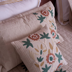 The Arizona Quilted Bedcover is a perfect blend of rustic charm and contemporary style. Crafted from soft cream-colored cotton linen fabric, this bedcover showcases intricate checks quilting patterns that add texture and depth. The Arizona is adorned with beautiful floral embroidery in earthy tones, bringing a touch of nature's beauty into your home. To complete the look, the matching cushion covers feature playful tassels, infusing a boho chic vibe into your decor.