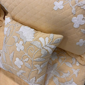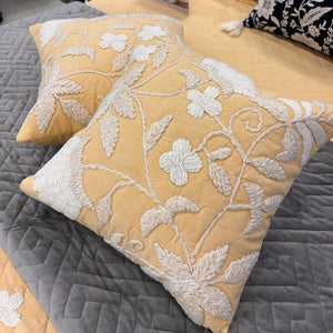 The true allure of Blair lies in its delicate white floral embroidery, which adds a touch of romance and refinement to the design. The bedcover's premium cotton linen is evident in every stitch, from the precise quilting and embroidery. Available in two captivating colors - a soft, dreamy pink and a cheerful lemon yellow. Completing this luxurious ensemble are matching pillow covers with dainty scalloped edges.