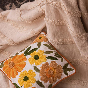 A customer favorite! Nothing says vibrant like this warm botanical cushion cover, Claire. With refreshing shades of yellows and oranges, the hand embroidered flowers bring a sense of liveliness to any living space!
