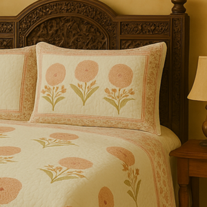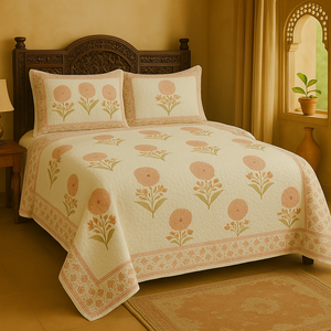 This breathable Jaipuri handblock quilt brings artisanal elegance to summer bedding. Meticulously crafted with traditional hand-printing techniques, its lightweight cotton construction ensures cool comfort while vibrant, intricate patterns showcase India's rich textile heritage. The perfect seasonal centerpiece for your bedroom.