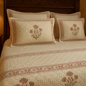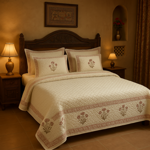 This breathable Jaipuri handblock quilt brings artisanal elegance to summer bedding. Meticulously crafted with traditional hand-printing techniques, its lightweight cotton construction ensures cool comfort while vibrant, intricate patterns showcase India's rich textile heritage. The perfect seasonal centerpiece for your bedroom.