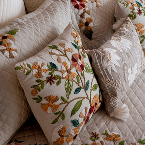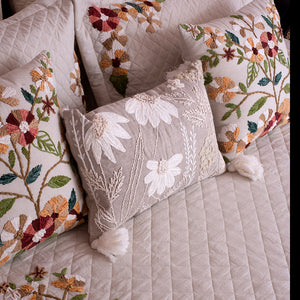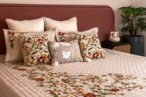 The Valentina Quilted Bedcover is a true epitome of sophistication and comfort. Crafted from ivory cotton linen, it features elegant diamond quilting patterns that add a refined touch to any bedroom. The floral embroidery in natural hues beautifully complements the fabric.